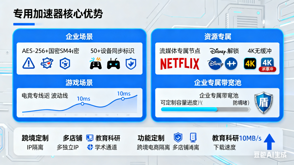 专用网络加速器是指针对某一特定使用场景(如企业跨境办公、游戏联机、海外流媒体观看)研发的加速工具,通过 “场景化技术适配 + 定制化服务”,实现比通用加速器更精准的优化。其核心优势集中在三个维度: